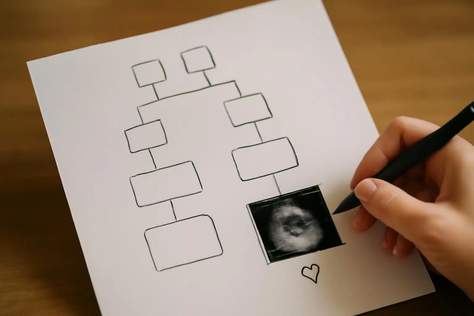 Co przygotować: Narysujcie lub wydrukujcie uproszczone drzewo genealogiczne Waszej rodziny. Na samym dole, obok Waszych imion, dorysujcie serduszko, odcisk stopy lub przyklejcie miniaturkę zdjęcia USG z podpisem „+ kruszynka, [data]”.