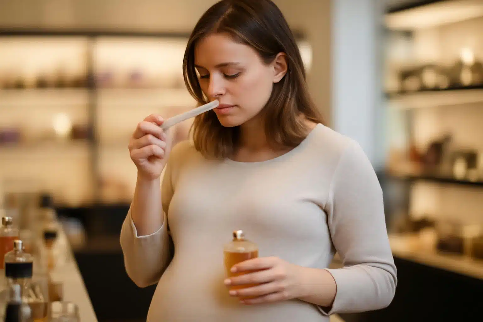 Naturalne nie zawsze znaczy obojętne. Olejki eteryczne to skoncentrowane esencje roślinne, które mogą mieć silne działanie biologiczne. W pierwszym trymestrze ciąży zaleca się szczególną ostrożność i generalnie ograniczenie ich stosowania, zwłaszcza w formie nierozcieńczonej na skórę. Niektóre olejki, jak np. szałwiowy, jałowcowy, rozmarynowy czy tymiankowy, bywają wymieniane jako te, których należy unikać ze względu na potencjalne działanie stymulujące macicę. Zawsze przed użyciem naturalnych perfum lub mieszanek opartych na olejkach skonsultuj się z lekarzem lub wykwalifikowanym aromaterapeutą znającym się na pracy z ciężarnymi.
