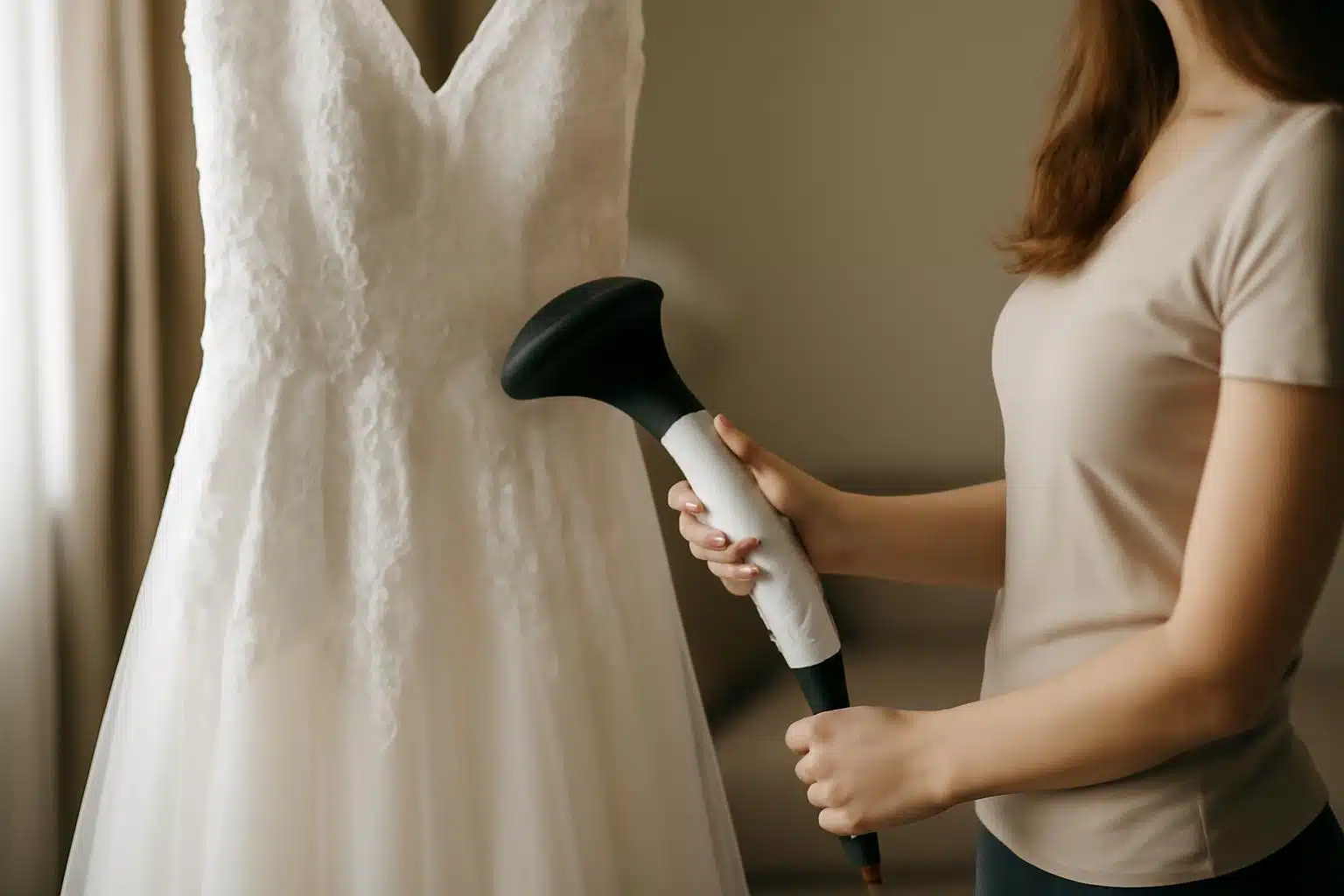 Nawet najlepiej przechowywana suknia może się odrobinę pognieść. Zdecydowanie odradzamy prasowanie żelazkiem – wysoka temperatura może stopić delikatne koronki, a przyciśnięcie żelazka może zostawić ślady. Najbezpieczniejszą metodą jest odparowanie parownicą (stojącą lub ręczną). Zachowaj ostrożność i dystans. Jeśli nie czujesz się na siłach, najlepiej zawieź suknię do profesjonalnego salonu, który oferuje takie usługi.
